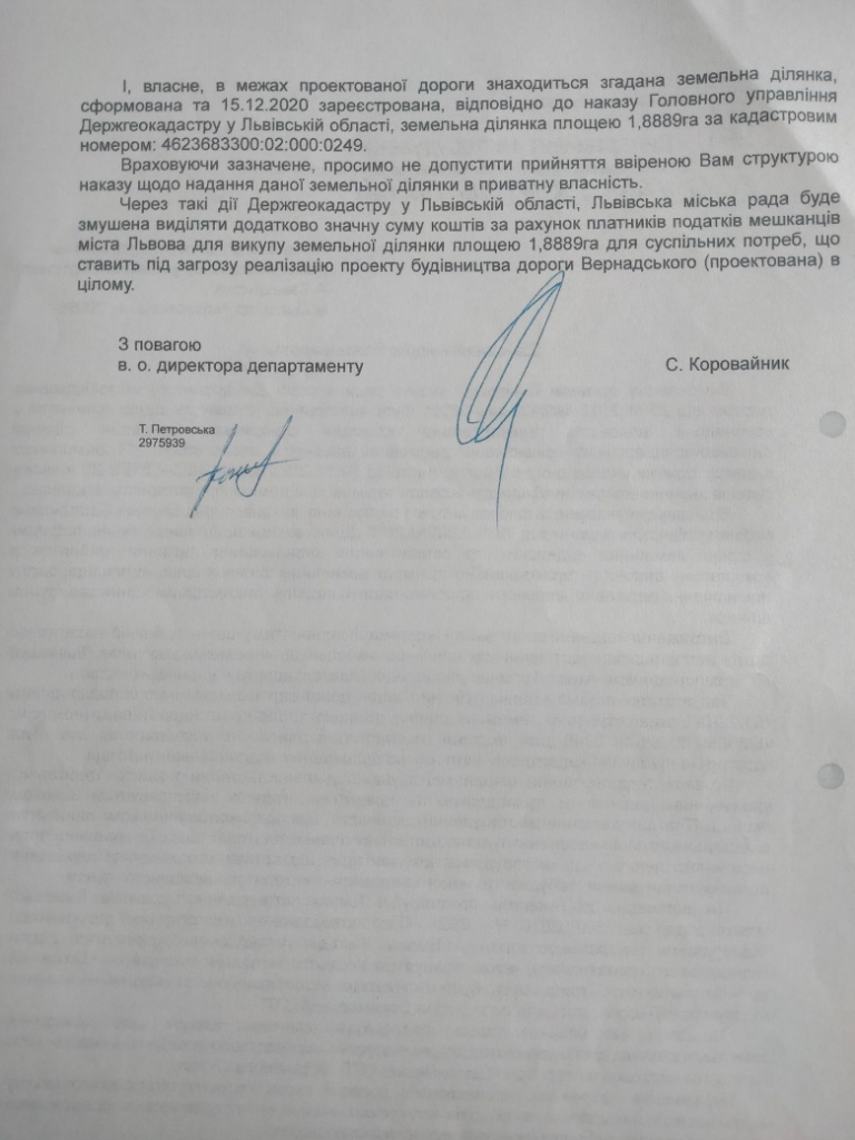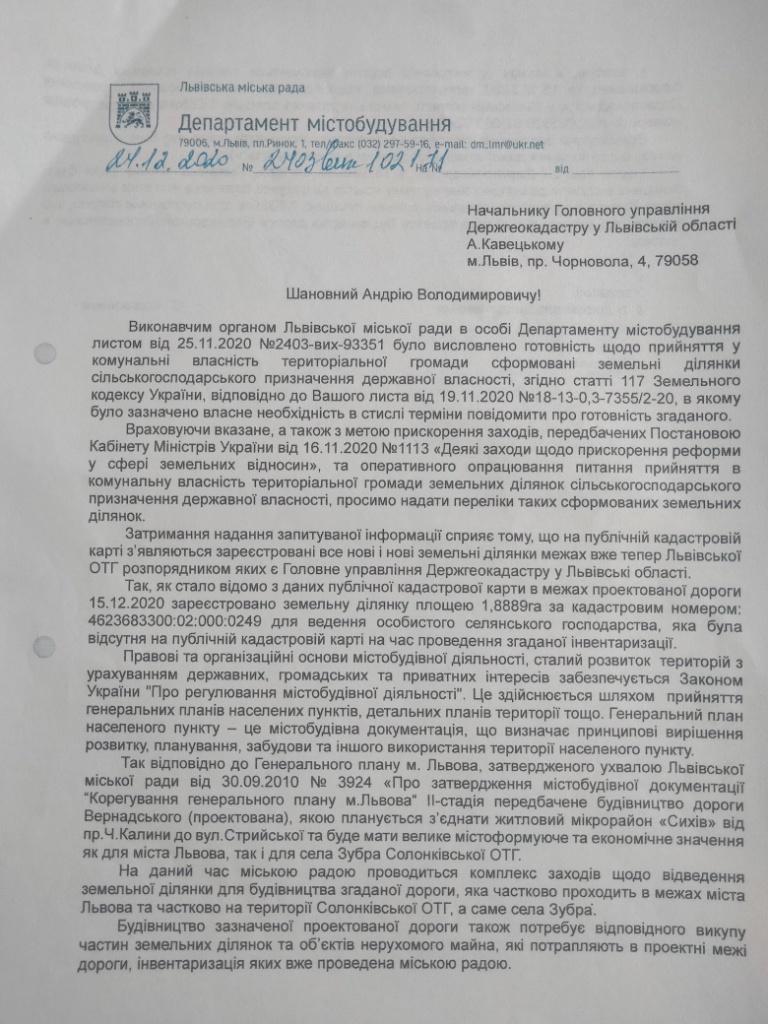 Львів не раз повідомляв Держгеокадастр про те, що цю ділянку не можна віддавати в приватну власність. Щойно ми побачили на кадастровій карті, що ця ділянка сформована і її можуть віддати третій особі, Департамент містобудування Львівської міськради відразу звернувся в обласне управління Держгеокадастру. Це було ще минулого року! Скеровував листи на Держгеокадастр і міський голова. Львів наполягав: тут буде стратегічно важливий інфраструктурний проект для Львова. Результат – два гектари просто посередині планованої розв’язки віддають у треті руки.